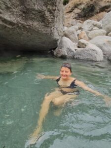 One by one, we stepped into the warm water—tentatively at first, then with bursts of laughter and squeals. Steam rose around us, clouds drifted above, and the mountains stood like sentinels in the distance.
